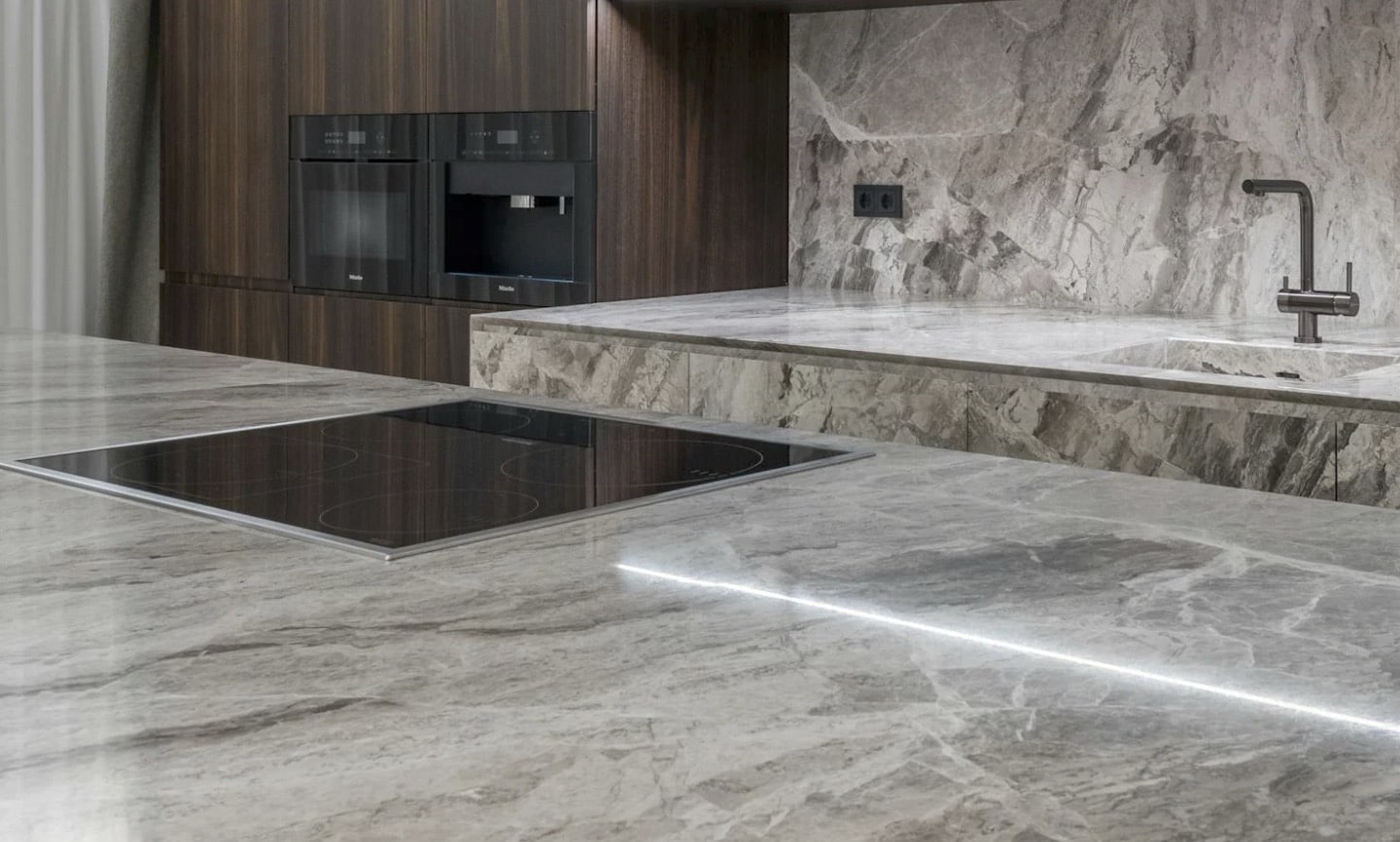 Quartzite has the look of marble with strong durability. It is a natural stone, so it typically needs sealing, but it performs well when maintained.